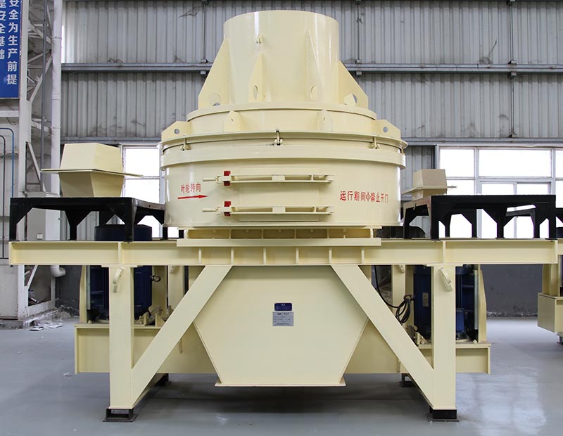 物料由進料斗進入制砂機,經分料器將物料分成兩部分,一部分由分料器中間進入高速旋轉的葉輪中,在葉輪內被迅速加速,其加速度可達數百倍重力加速度,然后以60-70米/秒的速度從葉輪三個均布的流道內拋射出去,首先同由分料器四周自收落下的一部分物料沖擊破碎,然后一起沖擊到渦支腔內物料襯層上,被物料襯層反彈,斜向上沖擊到渦動腔的頂部,又改變其運動方向,偏轉向下運動,從葉輪流道發射出來的物料形成連續的物料幕。這樣一塊物料在渦動破碎腔內受到兩次以至多次機率撞擊、磨擦和研磨破碎作用。被破碎的物料由下部排料口排出。