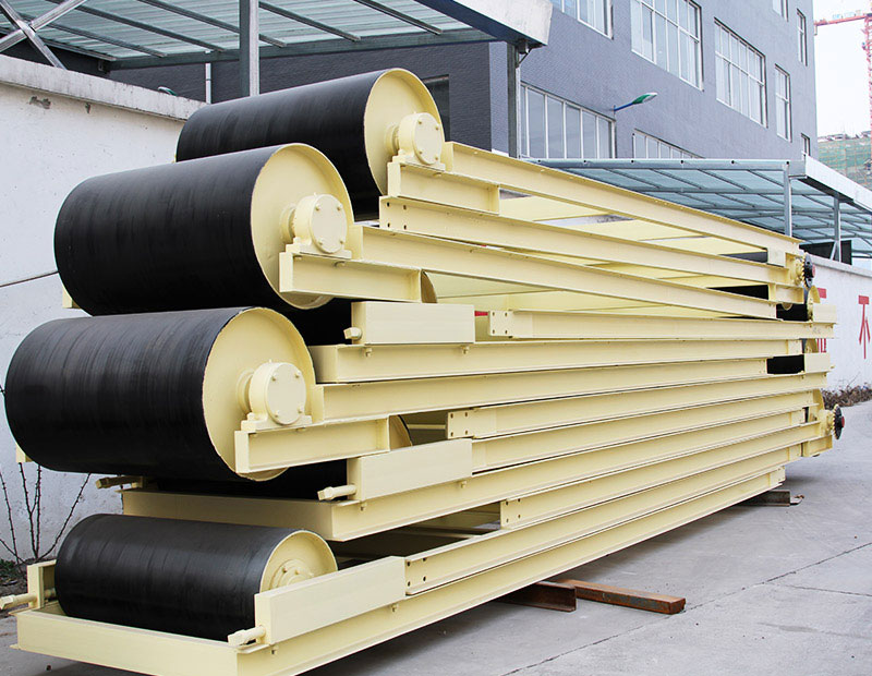 膠帶輸送機主要由機架、輸送皮帶、皮帶輥筒、張緊裝置、傳動裝置等組成。機身采用優質鋼板連接而成 ,由前后支腿的高低差形成機架,平面呈一定角度傾斜。機架上裝有皮帶輥筒、托輥等,用于帶動和支承輸送皮帶。有減速電機驅動和電動滾筒驅動兩種方式。