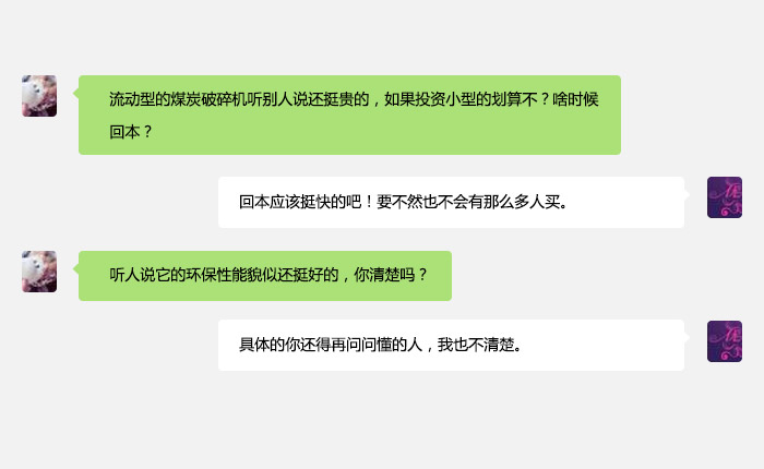 以上的對話是想要投資的人提出的,接下來,我可以為大家分享下已經(jīng)投資過小型流動煤炭破碎機(jī)的用戶評價(jià)。