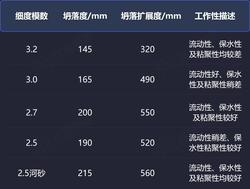 2、機制砂細度模數大于3.0時,新拌機制砂混凝土和易性差,易出現離析、泌漿及包裹性差等風險,細度模數小于2.7時,混凝土的流動性降低。