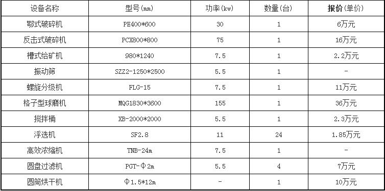 整套螢石礦選礦設備一般由振動給料機、顎式破碎機、細鄂式破碎機、圓錐破碎機、球磨機、皮帶運輸機、礦漿攪拌桶、浮選機、回轉窯、烘干機、濃密機等組成,其具體數量和設備型號等均需根據客戶實際生產情況進行具體設計配置。