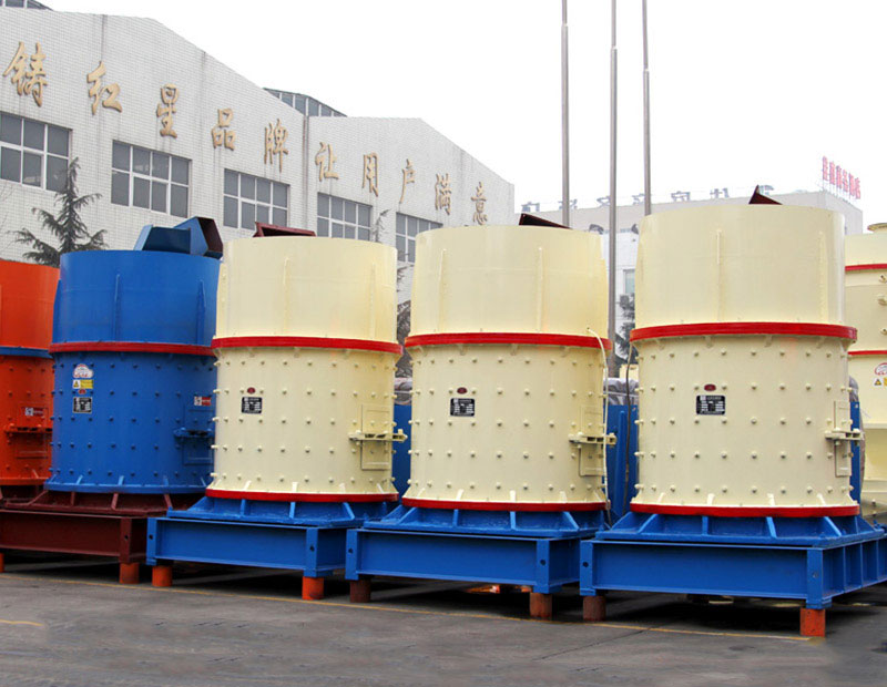 石料由立軸式復合破碎機上部垂直落入機體內(nèi),落入設備甩料盤上,離心力的作用下,物料被拋向筒體的內(nèi)壁,與安裝在內(nèi)壁上的反擊板猛烈碰撞,物料之間也發(fā)生猛烈的撞擊,物料得到破碎或者出現(xiàn)裂紋,之后物料進入錐形轉子腔后,下落過程中,經(jīng)沖壓、擠壓等作用實現(xiàn)破碎,物料進一步破碎成小顆粒,合格的成品從排料口排出即可。